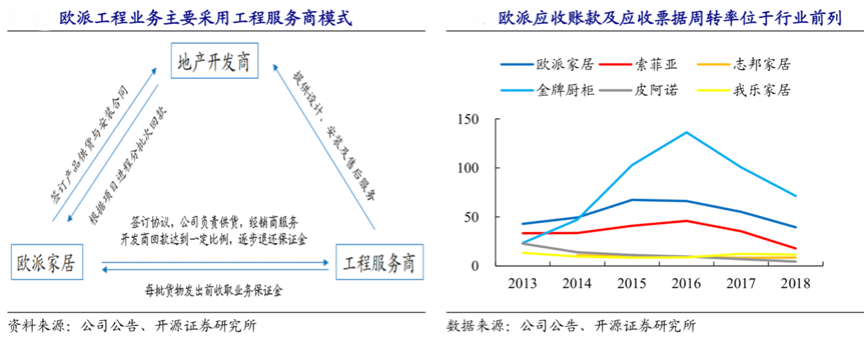 同時,根據公司公告、開源證券研究所等綜合資訊表明,歐派的大宗業務主要采用工程服務商模式。在項目過程中,工程服務商除先行承擔設計、安裝及 售后服務發生的所有相關費用外,還需為該項目中公司尚未收到的凈應收貨款提供 相應等額的保證金。歐派優質的工程服務商隊伍和全國化產能布局也保證 了歐派工程端出色的交付能力。