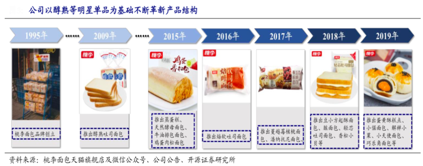 經(jīng)典案例:根據(jù)桃李面包天貓旗艦店及微信公眾號、公司公告及開源證券等綜合資訊表明,其產(chǎn)品主要以面包為主,月餅、粽子等節(jié)假日專供產(chǎn)品為輔,軟式面包、起酥面包、調(diào)理面包 3 大系列 30 余個品種,合計占據(jù)總營收的 97%以上。目前醇熟、天然酵母等明星單品年收入貢獻(xiàn)均已超過 10%。