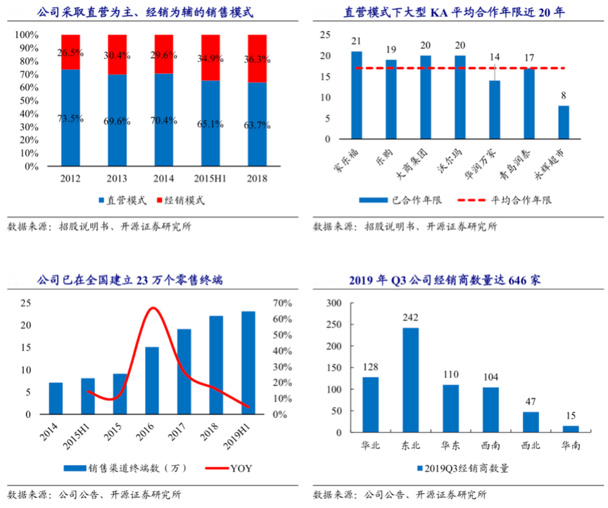 經(jīng)典案例:根據(jù)公司公告、招股說明書、開源證券研究所等綜合資訊表明,“桃李面包”與沃爾瑪、大潤發(fā)等大型商超之間的合作年限已將近 20 年,積累了產(chǎn)品鋪貨速度、陳列規(guī)模占比、訂單反饋及時性等方面的競爭優(yōu)勢。并要求與公司合作的經(jīng)銷商只能銷售桃李品牌面包,不能售賣其他品牌,具備較強(qiáng)的排他性。截至 2019 年 Q3 公 司已在東北、華北、西北、西南、華東等 17 個中心城市建立約 23 萬個零售終端,經(jīng)銷商數(shù)量已經(jīng)達(dá)到 646 家。