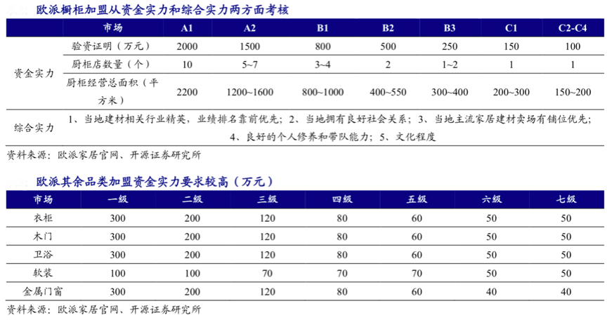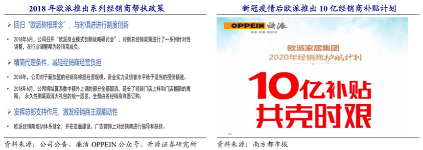 經典案例:根據歐派家居官網、開源證券研究所等綜合資訊表明,歐派櫥柜從資金實力和綜合實力兩方面考核加盟商,分品類對加盟商進行資金實力抬升要求,同時推出系列化的經銷商幫扶政策,從經營理念、代理篩選、總部支持及補貼計劃等方面強化對經銷商的大力支持,定制家居快速發展的過程就是“廠商協同作戰”的過程。