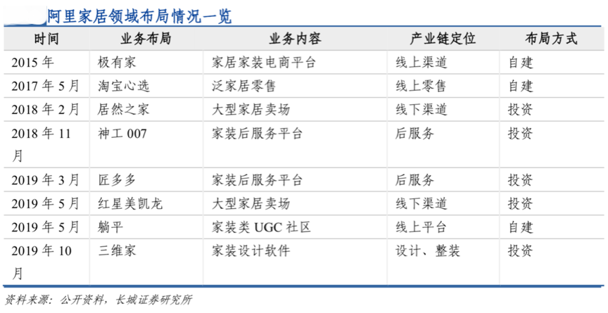 經典案例:阿里是國內知名的互聯網巨頭,根據公開資料、長城證券研究所等綜合資訊表明,其自2015年起開始試水家居布局,從家居家裝電商經營切入,大量布局家居零售賣場,并于2018年投資“神工007”進入“家裝后服務領域”,于2019年自建“躺平APP”,投資“三維家”,涉及家裝UGC和家裝設計軟件領域,使阿里家居新零售布局完成“家居新零售產業鏈”的“全鏈式布局”,產業鏈經營優勢大幅提升。