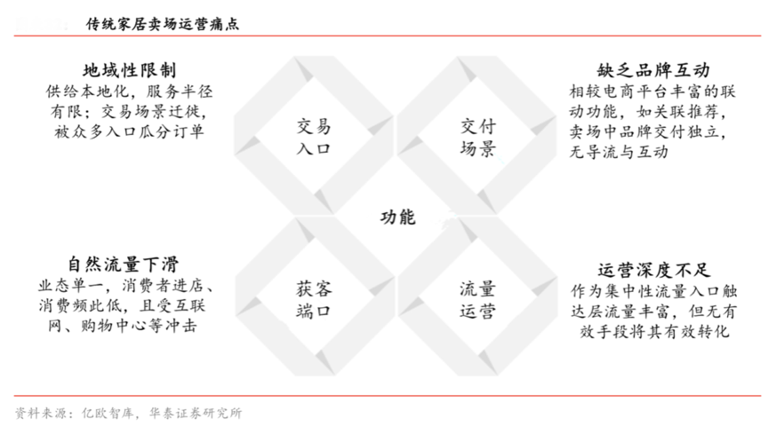 家居賣場有自己的運營痛點,有些“運營痛點”還比較痛,值得家居賣場新零售電商經營者深度洞察、創新解決。根據億歐智庫、華泰證券研究所等綜合資訊表明,傳統家居賣場運營痛點主要集中在地域、流量、品牌互動及運營深度等方面,其核心原因在于傳統的家居賣場依然是以“家居產品銷售及部分服務”為盈利模式的,以“家居賣場”流量運營為核心驅動力的,商業模式相對滯后,無法適應數字化技術驅動下的新家居、新零售和新商業的深度變革。