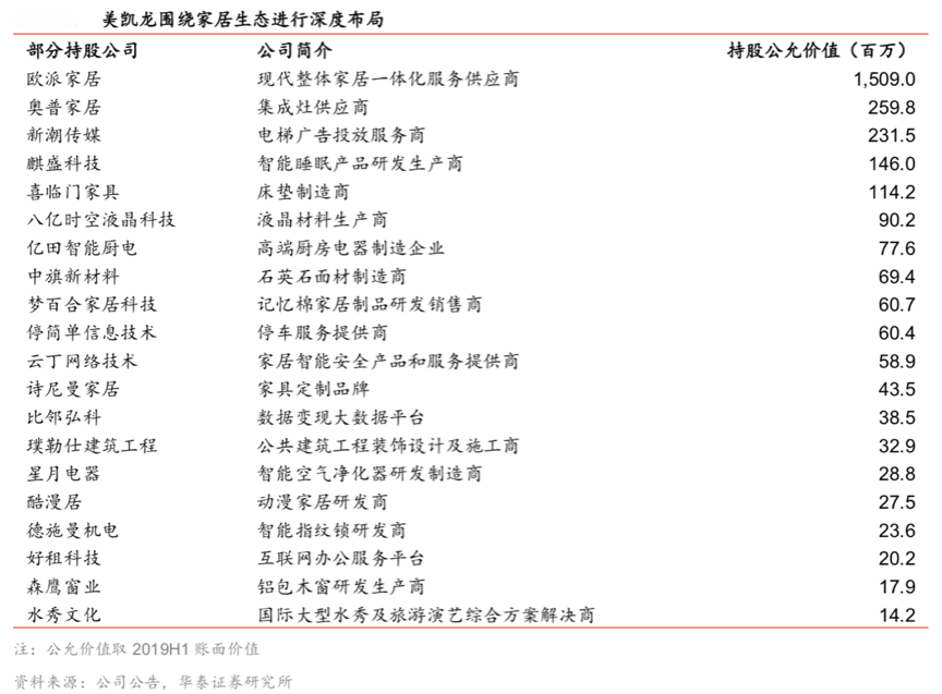 經典案例:根據公司公告、華泰證券研究所等綜合資訊表明,紅星美凱龍已經建立了相對完善的“家居產業生態鏈”,投資了歐派家居等知名企業。截至 2019H1,其通過投資公司間接持有歐派家居3.00%股份,通過香港子公司間接持有奧普家居 4.24% 股份,直接持有新潮傳媒 2.19%股份,通過子公司持有夢百合家居科技1.10%股份,真正實現了貫穿式“家居產業鏈”經營。
