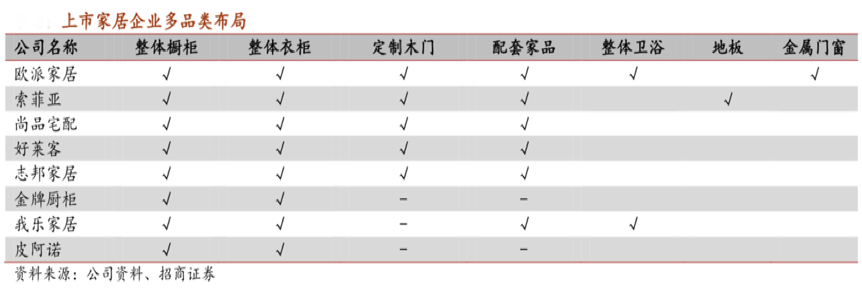 根據各知名公司資料、招商證券等綜合資訊表明,各上市家居企業大多已經進行了“家居多品類布局”,多品類布局意味著各家公司可以高效劃分產品角色,用標準化家居產品來引流,用定制化家居產品做大“客單價”,用科技化工具提升產品展示的場景感和代入感,發揮各家居品類的多重價值。