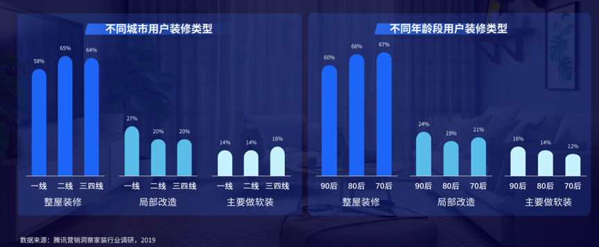 隨著一線城市房地產(chǎn)市場的飽和,購置住房并進(jìn)行整屋裝修的需求在二三四線城市得到更多釋放。在經(jīng)濟(jì)條件、個性家居風(fēng)格等影響下,局部改造的需求在90后群體中更加突出。根據(jù)《2019年騰訊營銷洞察家裝行業(yè)調(diào)研報(bào)告》等綜合資訊表明,二線以上城市對整屋裝修的認(rèn)可度更高,80后、70后對整屋裝修的認(rèn)可度更高,90后的局部改造等認(rèn)可度更高。