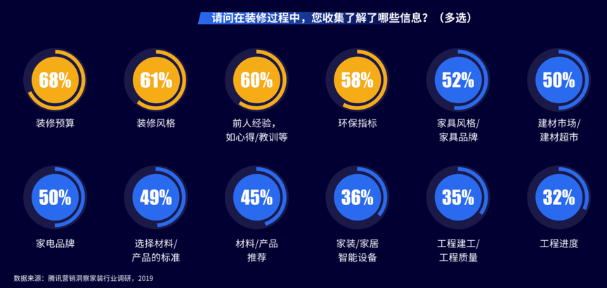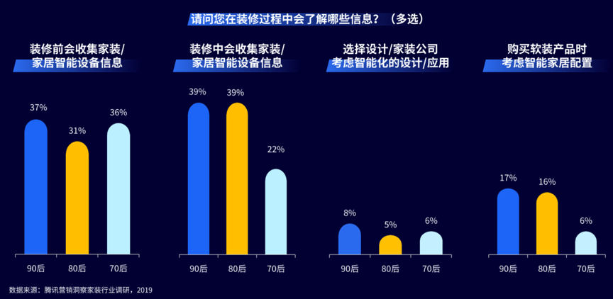 根據(jù)《2019年騰訊營銷洞察家裝行業(yè)調(diào)研報(bào)告》等綜合資訊表明,消費(fèi)者在裝修過程中想了解的信息大多涵蓋了“智能化”的信息,從家裝/家居智能設(shè)備信息到智能化的設(shè)計(jì)、應(yīng)用再到“智能家居”的配置,“智能家居生活”已經(jīng)成了家裝家居用戶的一大“關(guān)鍵性消費(fèi)訴求”。