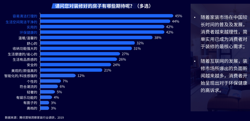 根據(jù)《2019年騰訊營銷洞察家裝行業(yè)調(diào)研報(bào)告》等綜合資訊表明,容易打理、簡潔干凈、實(shí)用、環(huán)保健康,是消費(fèi)者對家裝效果最主要的期待,消費(fèi)者的期望總會與家裝家居新零售電商的商品&服務(wù)有所偏差,這需要家裝家居新零售電商經(jīng)營放眼產(chǎn)業(yè)鏈經(jīng)營,深度洞察前端家裝家居舒適家居、舒心家裝等消費(fèi)需求,拉動家裝家居數(shù)字品牌營銷策劃,點(diǎn)亮全渠道品牌策劃營銷經(jīng)營,創(chuàng)新互動式品牌溝通。