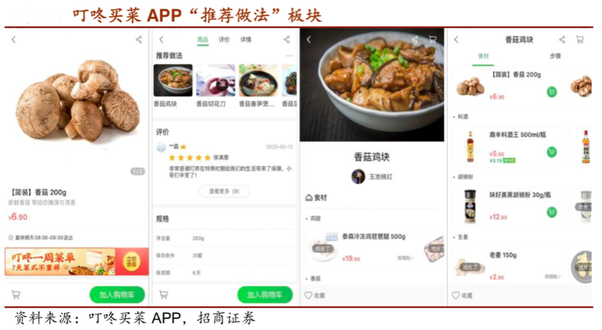 經典案例:據招商證券等資訊表明,叮咚買菜和菜譜類 APP下廚房合作,拉取下廚房用戶寫的菜譜,在叮咚買菜 APP“吃什么”板塊將各式菜譜展示給用戶,如“家常菜”、“一人食”、“下酒菜”等。
