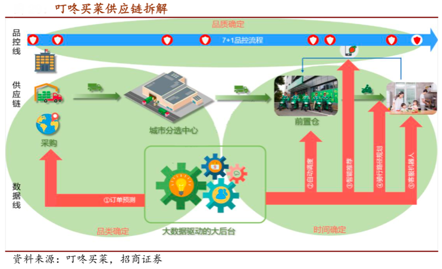 經典案例:據招商證券等資訊表明,叮咚買菜 70%~80%的蔬菜、水果品類在源頭做直采,絕大部分肉禽蛋品類和品牌商做 直采。截至 2019年7月,叮咚買菜已與 200 多家合作社、3000 余名農戶、養殖戶進 、行合作,進行源頭直采。源頭直采減少了中間商的各種中轉環節,最大限度減少損耗,保持新鮮,并且降低了成本。