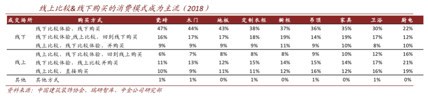 建材家居集合式購買、定制化消費持續提升,“全屋定制”需求日益旺盛。根據中國建筑裝飾協會、瑞研智庫、中金公司研究部等綜合資訊表明,品類方面超過 40%的消費者會選擇定制衣柜及定制櫥柜,也有超過 30%的消費者會選擇定制的書柜、電視柜和玄關柜,全屋定制需求日益旺盛,值得建材家居電商新零售企業重點關注。