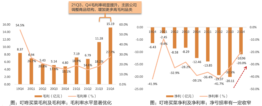 經典案例:根據叮咚買菜招股書、叮咚買菜年報、叮咚買菜季報、叮咚買菜2021Q4業績會紀要、天風證券研究所等綜合資訊表明,叮咚買菜公司毛利率從2019年的17.1%增至2021年的20.1%,原因在于公司商品力的不斷提高:1)公司自產自加工能力提升,產生額外毛利;2)公司上游供應鏈的長期投資開始見效;3)高毛利品類(如預制菜)的比例上升。