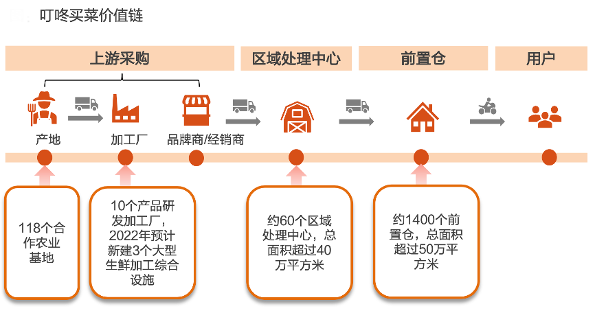 經(jīng)典案例:根據(jù)叮咚買菜2021Q4業(yè)績會PPT、東方網(wǎng)、天風證券研究所(數(shù)據(jù)截至2021年12月31日)等綜合資訊表明,叮咚買菜價值鏈主要包括上游采購、區(qū)域處理中心、前置倉、用戶四大組成部分。其中上游采購包括產(chǎn)地直采、自有品牌加工、品牌商/經(jīng)銷商采購三種方式。