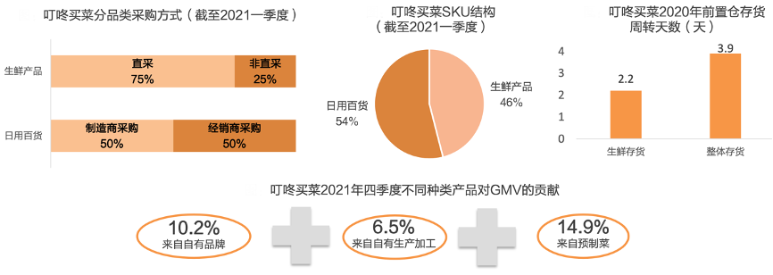 經(jīng)典案例:根據(jù)叮咚買菜招股書、叮咚買菜2021Q4業(yè)績會PPT、天風證券研究所等綜合資訊表明,叮咚買菜產(chǎn)品結(jié)構(gòu)不斷優(yōu)化,自有品牌、自有生產(chǎn)加工產(chǎn)品、預制菜比重上升。2021年四季度,自有生產(chǎn)加工產(chǎn)品在GMV中占比6.5%,預制菜在GMV中占比14.9%。