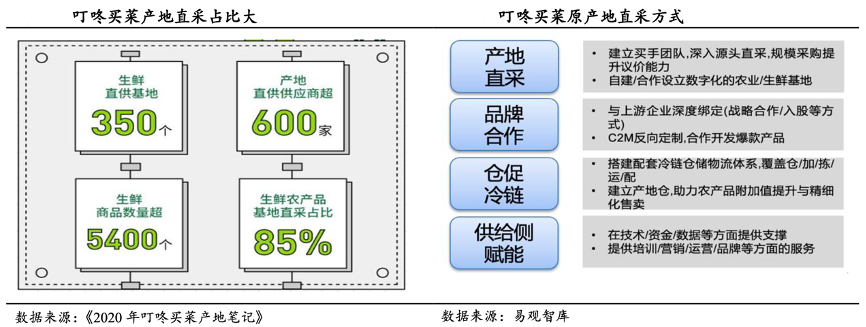 經典案例:根據《2020年叮咚買菜產地筆記》、易觀智庫、國泰君安證券研究等綜合資訊表明,叮咚買菜重倉供應鏈,通過產地直采、品牌合作,自己建立中心大倉、加工中心和冷鏈物流等方式來強化供應鏈,并且利用自身積累的技術和經驗賦能供給側。目前其建立了 350 個直供基地,產地直供供應商600 多家,生鮮直采比例達到79%。