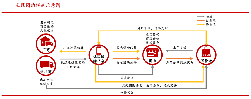 經(jīng)典案例:根據(jù)華西證券研究所等綜合資訊表明,從社區(qū)團(tuán)購模式整體來看,團(tuán)長是社區(qū)團(tuán)購鏈路的核心環(huán)節(jié)之一,是連接平方和消費者的中間紐帶。團(tuán)長負(fù)責(zé)進(jìn)行拉新、推薦、售后等工作,深入本地社群引流全年齡用戶,同時 進(jìn)行產(chǎn)品推薦、促進(jìn)銷售,進(jìn)而抽取一定規(guī)模傭金。