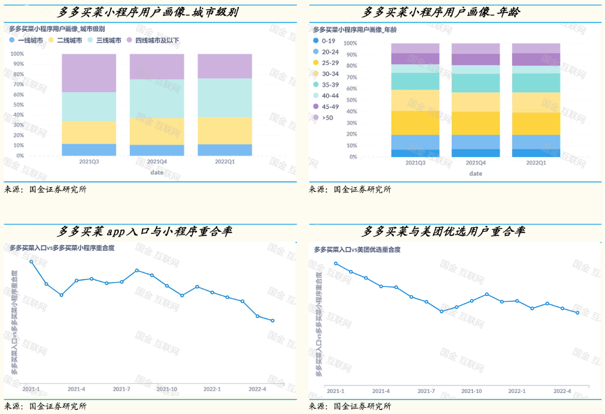 經典案例:根據國金證券研究所等綜合資訊表明,多多買菜在拼多多 App 首頁的中心位置,從首頁入口的社區團購活躍用戶規模約為拼多多整體用戶規模的21%,多多買菜的 App 首頁入口活躍用戶規模和小程序活躍用戶規模比例約為 3:1,用戶習慣逐漸養成,兩個渠道的用戶重合度逐漸下降到20%,多多買菜和美團優選小程序用戶重合率近半年逐漸降低。