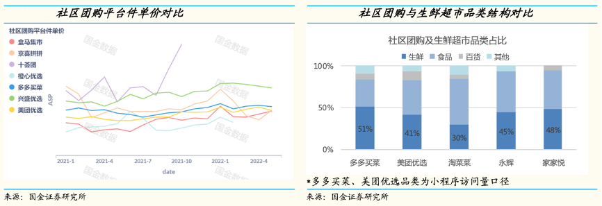經典案例:根據國金證券研究所等綜合資訊表明,2020年8月拼多多公司推出多多買菜業務,截至目前多多買菜市場份額達到42%,龍頭優勢明顯。公司傳統優勢品類-生鮮農產品(果蔬肉蛋)是主要的銷售來源。從多多買菜小程序的品 類訪問結構來看,蔬菜/水果/肉蛋占比近一半。生鮮平均單價低于標品及百貨,預計低毛利的生鮮品類占比低于50%。