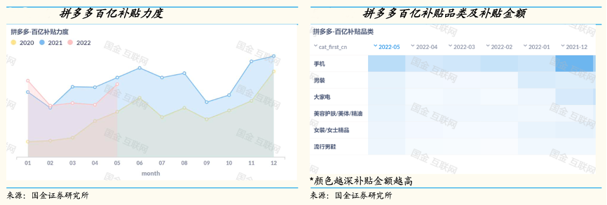 經典案例:根據國金證券研究所等綜合資訊表明,2019年6月,拼多多公司推出百億補貼計劃,聯合品牌商家補貼上萬款商品。補貼力度:2021年相比2020年補貼力度持續提升,2022 年 3 月至 5 月期間主要受疫情影響,可選品類的消費需求走弱,商家補貼意愿和營銷投放意愿降低。補貼品類方面,手機、家電、化妝品、服飾等為補貼的重點品類。