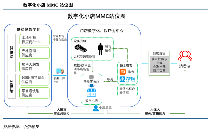 經典案例:根據中信建投等綜合資訊表明,相比于美團的線下地推以及多多買菜的社交裂變,阿里依托零售通背后下沉市場的 100 多萬實體門店資源,一方面將門店數字化,通過淘寶、支付寶完成線上獲客,另一方面其在選品和供應鏈上更加面向下沉市場,固定經營場所增加服務確定性,穩定的鄰里關系提供個性化分層服務,數字感知設備入場能讓小店聚攏規模化需求,反哺生產端,有利于建立基于下沉市場小店模式的社區團購。