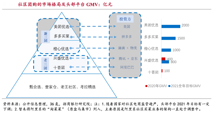 經(jīng)典案例:根據(jù)公開信息整理、36氪、招商銀行研究院等綜合資訊表明,目前社區(qū)團(tuán)購第一、第二梯隊(duì)主要包括背靠互聯(lián)網(wǎng)小巨頭流量支持的“新三團(tuán)”美團(tuán)優(yōu)選(美團(tuán))、多多買菜(拼多多)、橙心優(yōu)選(滴滴)和從社區(qū)團(tuán)購混戰(zhàn)中幸存的“老三團(tuán)”成員興盛優(yōu)選、十薈團(tuán)1,其他社區(qū)團(tuán)購平臺(tái)還包括甄會(huì)選、壹家倉等小型平臺(tái)。