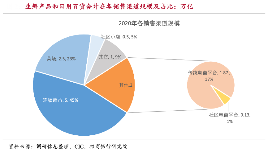 經(jīng)典案例:根據(jù)調(diào)研信息、CIC、招商銀行研究院等綜合資訊表明,生鮮電商以銷售生鮮產(chǎn)品和日用百貨為主線上銷售平臺(tái),其中生鮮作為通路商品實(shí)現(xiàn)引流,輔以高毛利日用百貨作為其盈利來源。根據(jù) CIC 數(shù)據(jù),2020年我國整體生鮮+日用百貨的合計(jì)市場(chǎng)規(guī)模約為 11 萬億(生鮮 5 萬億、日百 6 萬億),對(duì)應(yīng)電商銷售規(guī)模約 2 萬億,滲透率約 19%。與之品類相似的線下渠道主要包括連鎖商超、菜場(chǎng)、社區(qū)小店等,對(duì)應(yīng)市場(chǎng)規(guī)模分別約 5、2.5、0.5萬億。