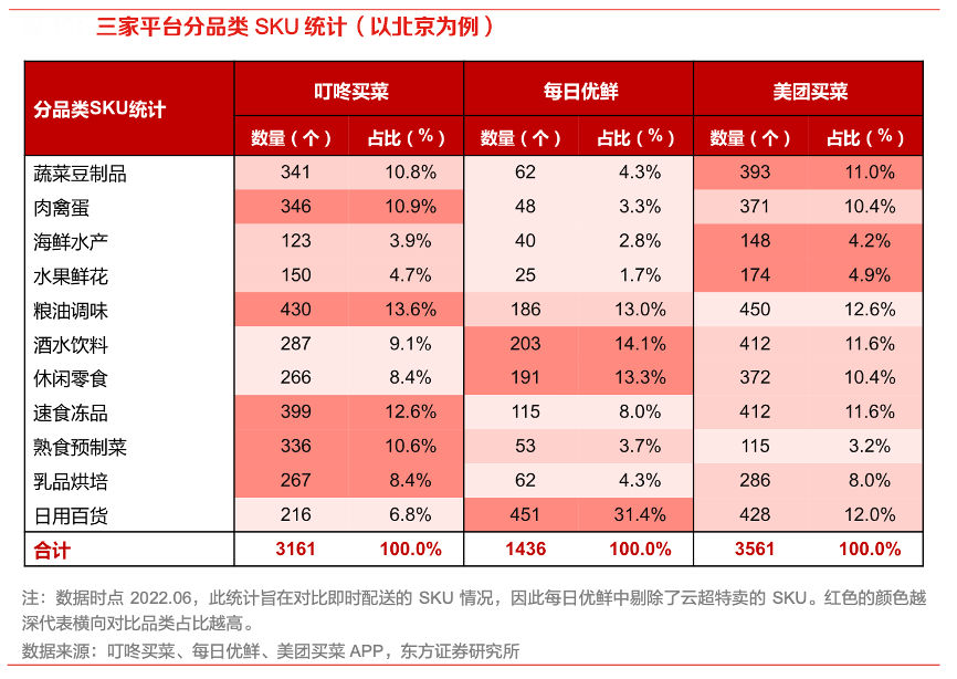 經(jīng)典案例:根據(jù)叮咚買菜、每日優(yōu)鮮、美團買菜APP、東方證券研究所等綜合資訊表明,在商品品類結(jié)構(gòu)方面,叮咚主打自有品牌提高客單價,多速食凍品、熟食預制菜、乳品烘培品類商品,其合計 SKU 占比約為 31.6%,而美團買菜 SKU 品類結(jié)構(gòu)相對均衡,傳統(tǒng)生鮮占比相對較高,其在戰(zhàn)略上維穩(wěn)平衡,提高客單價更多依靠向用戶提供豐富均衡的品類選擇。