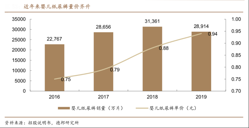 經(jīng)典案例:根據(jù)公司官網(wǎng)、德邦研究所等綜合資訊表明,百亞股份除衛(wèi)生巾外,積極進(jìn)行多品類布局,在嬰兒紙尿褲、成人失禁用品商均有所涉獵。其在嬰兒紙尿褲方面,好之紙尿褲的銷量從 2016 年的 2.27 億 片提升到2019 年的 2.89 億片,年化增速達(dá)到 8.3%。