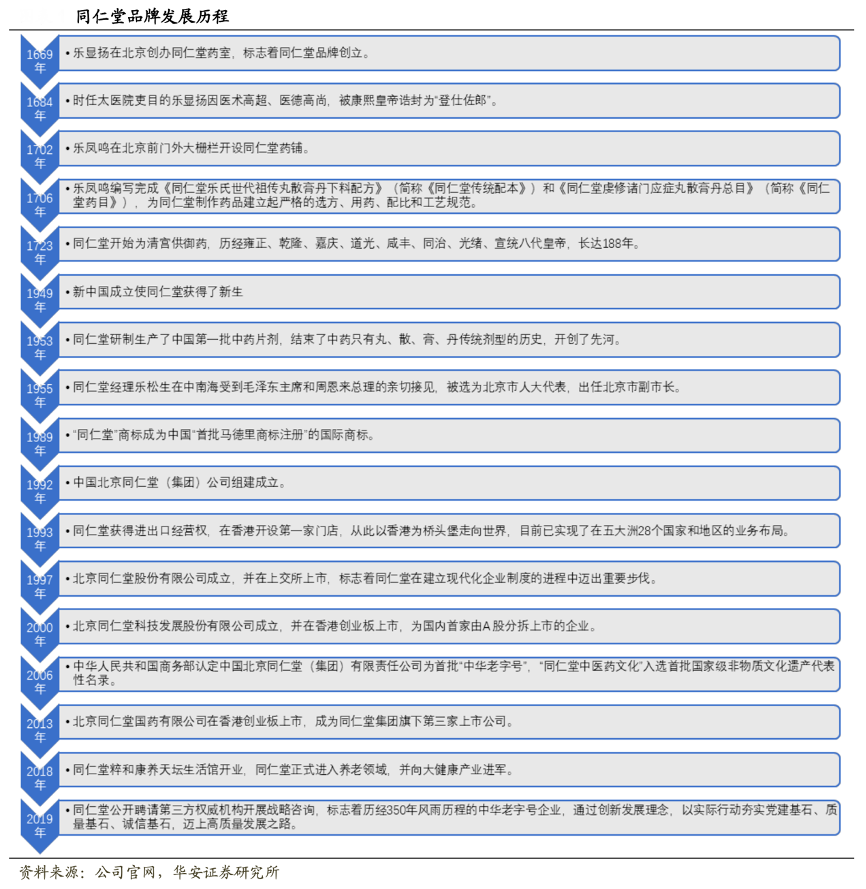 經典案例:根據公司官網、華安證券研究所等綜合資訊表明,同仁堂品牌始創于 1669 年(清康熙八年),至今已有 352 年歷史,自 1723 年(清 雍正元年)為清宮供御藥。同仁堂集團作為首批中華老字號企業,1992年中國北京同仁堂集團公司組建并于2001年改制為國有獨資公司,1997 年旗下同仁堂股份在 上海上交所上市,2000 年同仁堂科技在香港聯交所上市,2013 年同仁堂國藥在香 港聯交所上市。