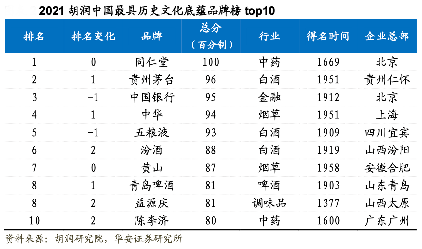 經典案例:根據胡潤研究院、華安證券研究所等綜合資訊表明,2021 年 10 月胡潤研究院發布《2021 胡潤中國最具歷史文化底 蘊品牌榜》,該榜單調研范圍涵蓋中國內地具有 60 年以上歷史的為消費者提供產品或服務的品牌,綜合考察品牌歷史、價值和文化內涵三個維度,以每個品牌的總分(百分制)進行排名。同仁堂以滿分位列榜首,凸顯其自身的品牌價值。