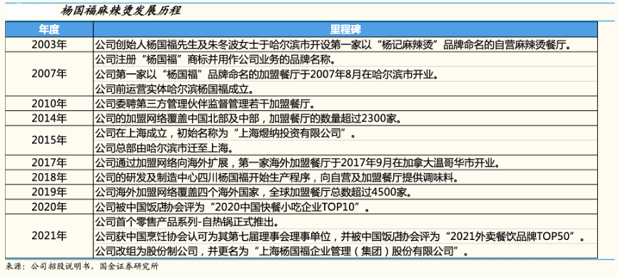 經典案例:根據公司招股說明書、國金證券研究所等綜合資訊表明,楊國福公司成立于 2003 年,歷經 19 年的發展,創新打造“可以喝的麻辣燙”湯底配方、“斤式自選”服務模式和“單人單鍋”烹飪方式,重塑消費者對麻辣燙的觀感。根據弗若斯特沙利文數據,按商品交易總額以及餐廳數量計算,2020年公司以 49 億商品交易額、5238 家門店在國內中式快餐市場排名第一,市占率約 0.7%。