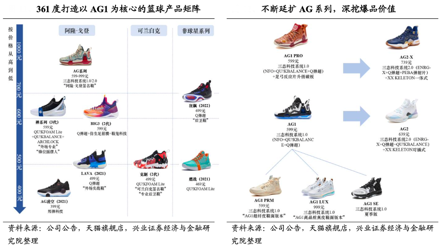 經典案例:根據公司公告、天貓旗艦店、興業證券經濟與金融研究院等綜合資訊表明,2021年雙十一期間,AG1 系列銷量達 10 萬雙,直接帶動流水約 3000 萬元。361度深度開發 AG1 的產品潛力,設計多類型 AG1 衍生款,包括專業性能更優的 AG1 PRO,匹配不同穿搭需求的真皮版本和超纖皮革版本以及夏季輕薄版本 AG1 SE。同時,打造多款 AG 系列支線鞋款,包括適用外場的禪系列和 LAVA,以及 AG 凌空等鞋款,皆憑借科技感與設計性俘獲口碑。籃球品類近年來營收增速快速增長,2021年籃球鞋類產品銷售量超 20 萬雙,零售額約 7063 萬元。