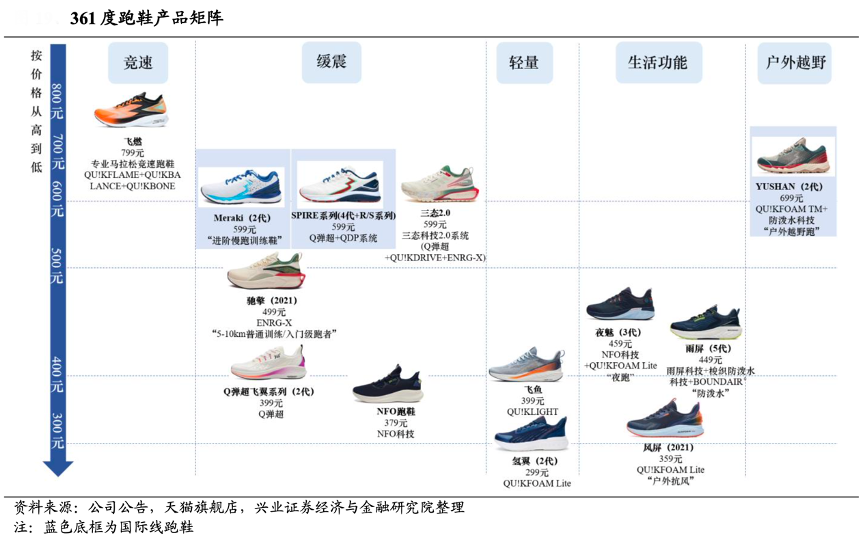經典案例:根據公司公告、天貓旗艦店、興業證券經濟與金融研究院等綜合資訊表明,361 度深耕防潑水科技已久,搭載防潑水科技的雨屏跑鞋是特色產品,2015年開始研發,2017年誕生,至今已然迭代 5 代;其還陸續推出主打抗風特質的“風屏跑鞋”,為夜跑定制的“夜魅跑鞋”,361度已經在跑步鞋類產品建立起了一定競爭壁壘,市場認可度頗高。