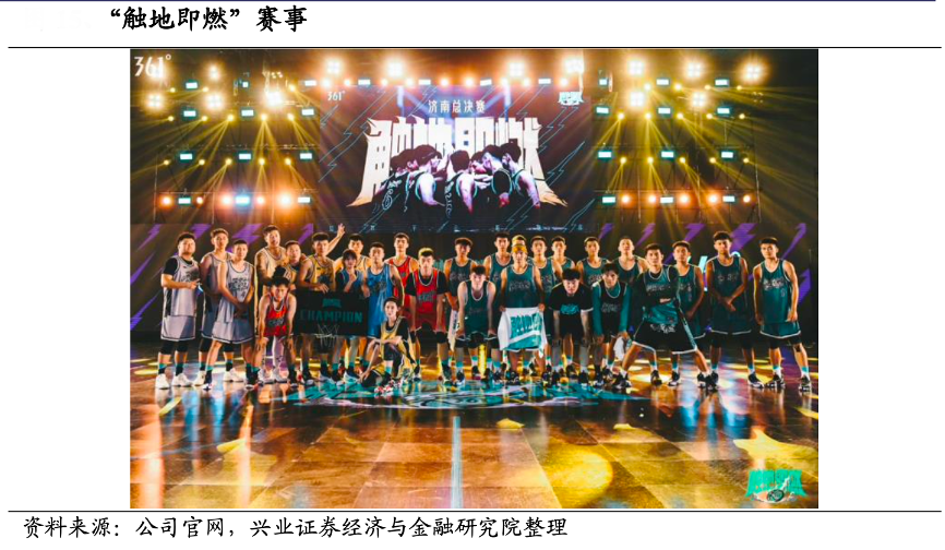 經典案例:根據公司官網、興業證券經濟與金融研究院等綜合資訊表明,361度啟動草根籃球的布局,打造籃球自有賽事IP——觸地即燃賽事。其目前已經開辦兩屆觸地即燃賽事,第一屆以扣籃大賽為切入點,第二屆則設點7 個城市展開海選,共有 232 個球隊參與,在草根球員心中烙下深刻的品牌烙印,培養消費者對品牌專業性的認知度。