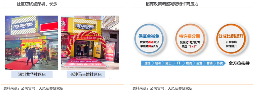 經典案例:根據公司官網、天風證券研究所等綜合資訊表明,疫情下消費者居家時間延長,社區消費增加,周黑鴨公司探索社區開店模式。目前武漢社區店超 200 家,店效處于行業領先水平,2021年長沙、合肥、廣州、深圳試點社區店 22 家,成功率91%。公司通過減免保證金、分期特許費、提升分成比例,減輕特許商開店壓力,推進新開店 1000 家規劃,2022 年一季度已開門店 200 家。