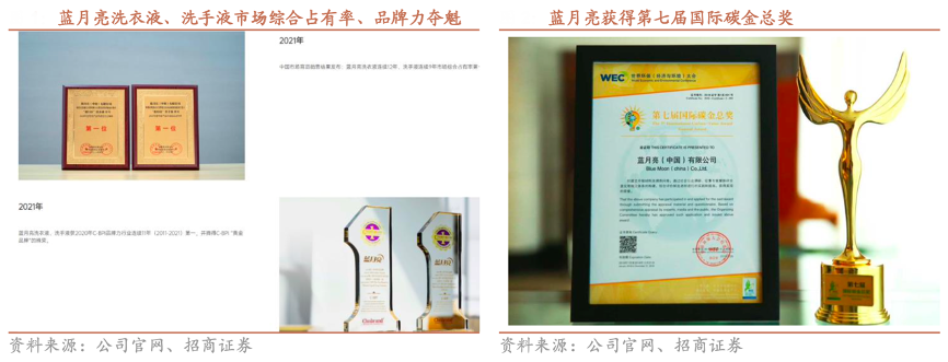 經典案例:根據公司官網、招商證券等綜合資訊表明,結合中國商業聯 合會、中華全國商業信息中心統計數據,藍月亮洗衣液連續 12 年(2009-2020)、洗手液連續 9 年(2012-2020)行 業市場綜合占有率第一,在 Chnbrand 發布的中國品牌力指數品牌排名中,藍月亮洗衣液、洗手液品牌力指數連續 11 年(2011-2021)第一。其堅持可持續發展理念,在國內外屢獲環境保護、社會公益獎項。