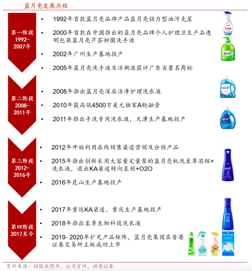 經典案例:根據招股說明書、公司官網、招商證券等綜合資訊表明,藍月亮于2008年在全國率先推廣洗衣液,改變十余億中國人的洗衣習慣,推動洗衣粉轉向洗衣液的跨越式升級;于2011年推出藍月亮手 洗專用洗衣液,倡導專品專用清潔理念;于2015年推出藍月亮機洗至尊濃縮+洗衣液,在國內屬采用濃縮技術的第一梯隊,再次推動中國洗滌行業市場變革,由普通型洗衣液跨越升級為濃縮型洗衣液。