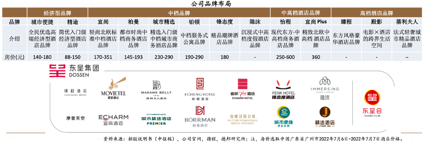 經典案例:根據招股說明書、公司官網、攜程、德邦研究所等綜合資訊表明,東呈酒店聚焦大眾出行住宿市場,為大眾出行者提供高性價比住宿體驗,目前已累計開發 13 個自主品牌、接近 30 項酒店產品,已形成覆蓋經濟型(2個)、中檔(6個)、中高檔(2個)和高檔(3個)的酒店品牌體系,其中檔酒店定價相對更低,也與全季等其他酒店集團中端產品形成差異化競爭。