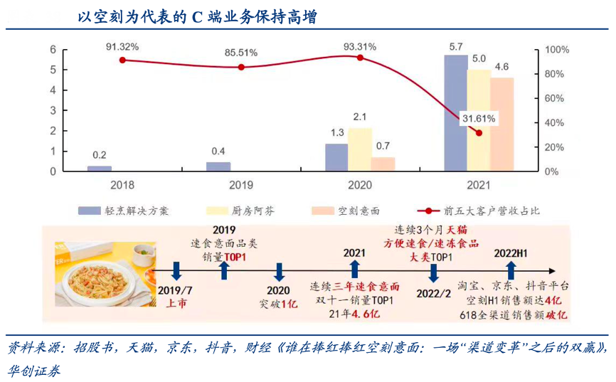 經典案例:根據招股書、天貓、京東、抖音、財經《誰在捧紅捧紅空刻意面:一場“渠道變革”之后的雙贏》、華創證券等綜合資訊表明,空刻意面 2019 年 7 月創立,在拉 面說/自嗨鍋等中式速食品牌涌現的背景下,切入西式速食。當年就成為速食意面品類銷 量 TOP1,2020年銷售額突破 1 億。