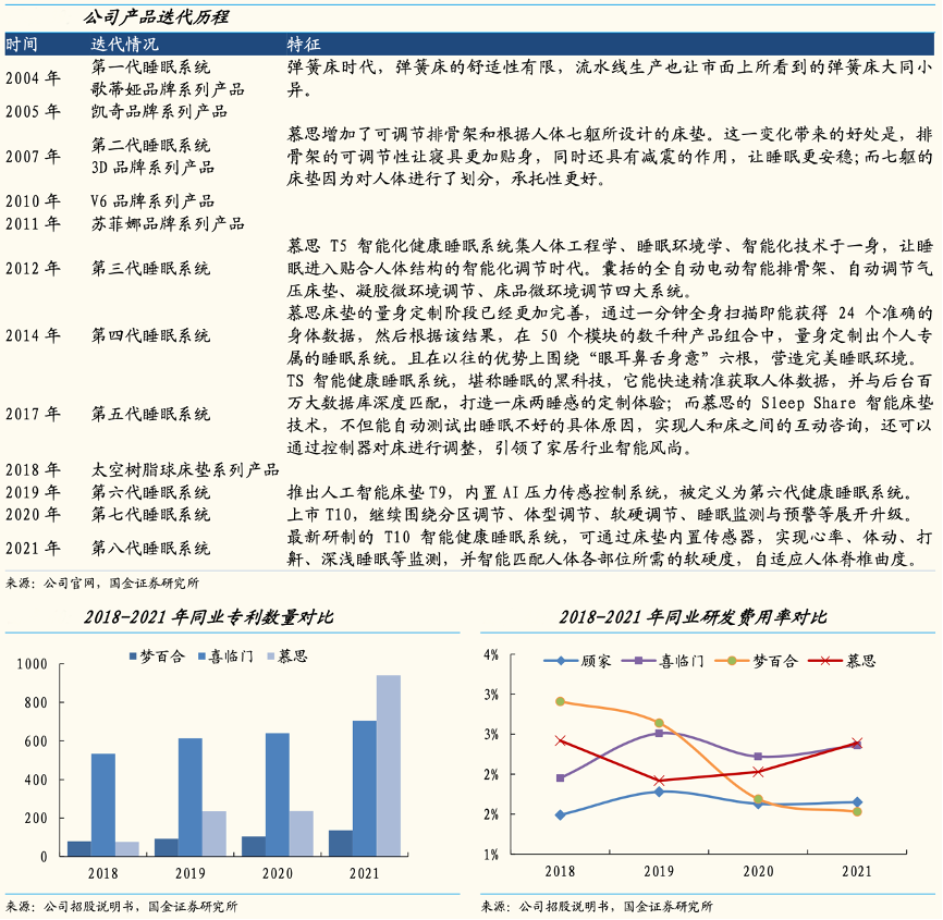 經(jīng)典案例:根據(jù)公司官網(wǎng)、公司招股說(shuō)明書、國(guó)金證券研究所等綜合資訊表明,慕斯公司通過(guò)推行端到端的 IPD 集成產(chǎn)品開發(fā)模式,縮短開發(fā)周期和提升新品上市率,提升產(chǎn)品迭代速度。其將人體工程學(xué)、睡眠環(huán)境學(xué)、智能化技術(shù)融入到產(chǎn)品設(shè)計(jì)中,通過(guò)軟件、硬件不斷升級(jí),先后發(fā)布第一到第八代健康睡眠系統(tǒng),且從最開始的 2-5 年迭代一次到近三年每年迭代一次。