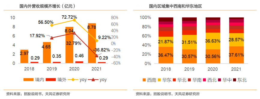 經典案例:根據招股說明書、天風證券研究所等綜合資訊表明,分地區來看,阿寬食品國內市場的營收占比72%左右,主要集中于西南和華東區域。西南地區為公司總部及主要工廠所在,品牌知名度和市場認可度較高,銷售渠道較為健全;華東地區居民消費能力強,方便食品消費需求較大,公司定制銷客戶集中。