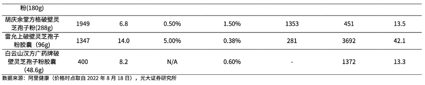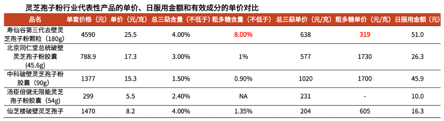 經(jīng)典案例:根據(jù)阿里健康、光大證券研究所等綜合資訊表明,在同類的靈芝孢子粉中,壽仙谷的主打產(chǎn)品第三代去壁靈芝孢子粉的有效成分含量(靈芝三萜、靈芝多糖) 超越同行,特別是粗多糖(具有抑制腫瘤和增加機(jī)體免疫力的功能),雖然其單價(jià)與日服用金額也是同類產(chǎn)品中最高的,但是有效成分的性價(jià)比高。