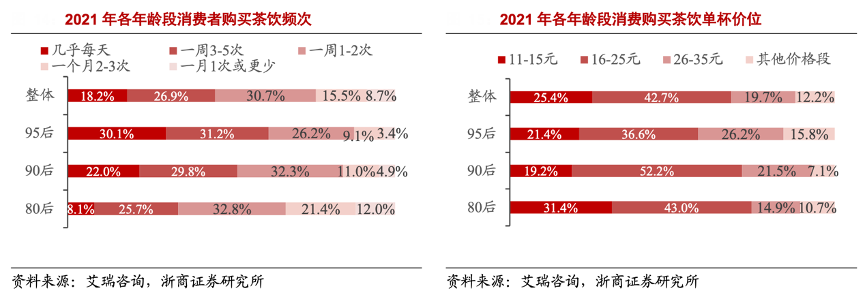 經(jīng)典案例:根據(jù)艾瑞咨詢、浙商證券研究所等綜合資訊表明,從2021年各年齡段消費者購買茶飲頻次分布數(shù)據(jù)來看,年輕群體消費茶飲的頻次更高,以 95 后為 例,30.1%的 95 后消費者幾乎每天購買茶飲,31.2%的 95 后一周購買茶飲 3-5 次。另外,從茶飲單杯價位來看,95后選購 26-35 元價格帶的比例最高,達到26.2%。