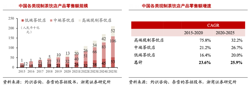 經(jīng)典案例:根據(jù)灼識咨詢、奈雪的茶招股書、浙商證券研究所等綜合資訊表明,從零售額占比來看,2020 年中國高端現(xiàn)制茶飲零售額占中國整體現(xiàn)制茶飲的 19.7%,截至 2020 年 12 月 31 日,中國約有 34.8 萬間現(xiàn)制茶飲店,其中高端現(xiàn)制茶飲店約 3400 家,中端約 14.15 萬家,低端約 20.35 萬家,高端門店數(shù)量占比約1%,結(jié)合零售額占比,高端茶飲店平均店效遙遙領(lǐng)先。