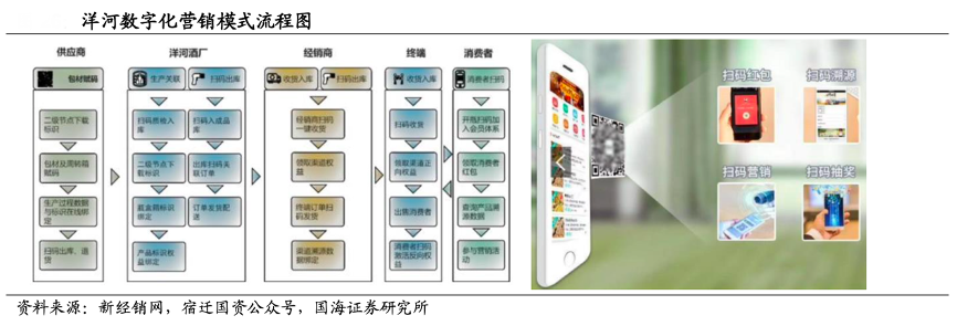 經(jīng)典案例:根據(jù)新經(jīng)銷網(wǎng)、宿遷國(guó)資公眾號(hào)、國(guó)海證券研究所等綜合資訊表明,洋河“數(shù)字化營(yíng)銷模式”通過數(shù)字化掃碼掌握消費(fèi)者實(shí)際開瓶數(shù)據(jù)、及渠道(經(jīng)銷 商、煙酒店)進(jìn)出庫數(shù)據(jù),獲知需求端及渠道端數(shù)據(jù),已實(shí)現(xiàn)掌握消費(fèi)者實(shí)際 需求情況以匹配供給端發(fā)貨,形成市場(chǎng)供求關(guān)系長(zhǎng)期緊平衡的目的,并進(jìn)一步保障了控盤分利制度的落地,維持經(jīng)銷商積極性。