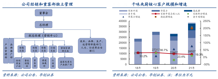經典案例:根據公司公告、華創證券等綜合資訊表明,千味央廚成立對接大客戶的內部小組,董事長和總經理為小組負責人,營銷部門單獨設立重客部,確保快速響應大客戶的需求,在具體開發過程中,公司梳理各餐飲消費場景的頭部客戶,自上而下從 TOP3 向 TOP10 拓展新客戶,并成立包括市場、研發、商務等專項小組,由專項組與客戶溝通定向解決問題,如千味憑借產品質量與成本控制,同 KFC 合作30個SKU,油條、撻皮供應份額分別高達100%、80%。