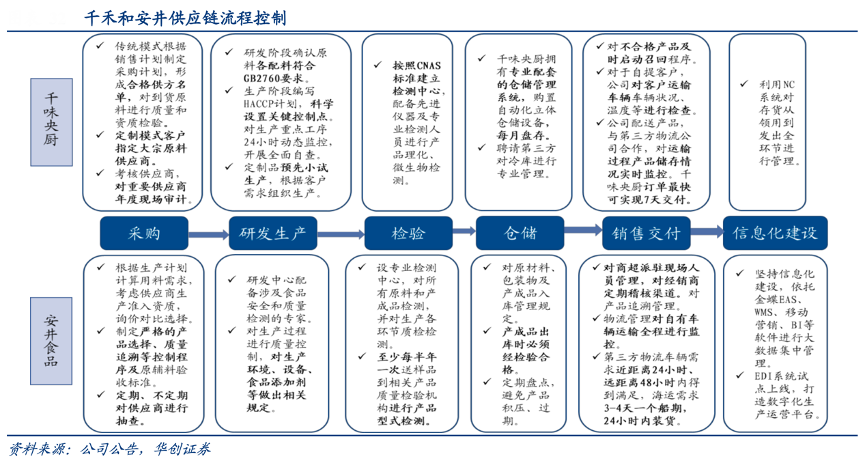 經典案例:根據公司公告、華創證券等綜合資訊表明,千味央廚已形成全流程完備供應鏈。采購端方面,公司聯合眾品、黃河金等食材商共同成立了餐飲食材聯盟,與供應商合作在全國建立蔬菜基地,并要求供應商提供相應檢測報告。質控端方面,其引入無死角監控系統,同時配備專業質檢團隊監測各工藝節點,保證生產嚴格按流程進行。