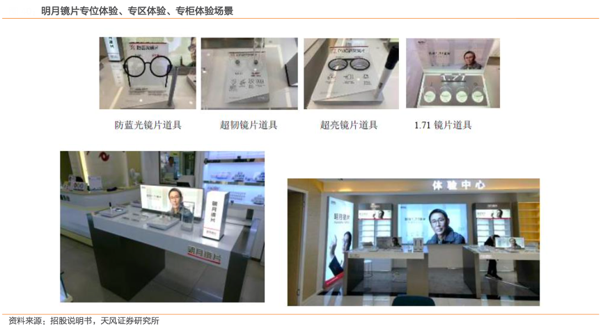 經典案例:根據招股說明書、2021年年報、天風證券研究所等綜合資訊表明,明月鏡片公司通過合作建立專位體驗、專區體驗、專柜體驗和專賣店的方式,一方面讓消費者直觀感受鏡片的功能與優點,另一方面提升“明月鏡片”品牌形象,逐步占據消費者心智。同時,公司針對每個區域均配備了專業的銷售推廣隊伍,能夠快速識別合作方需求、進行精準反饋。