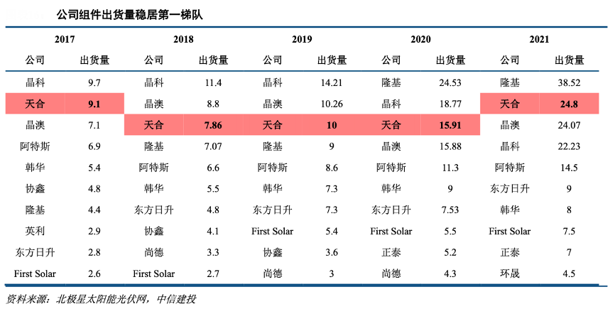 經典案例:根據北極星太陽能光伏網、中信建投等綜合資訊表明,天合光能公司作為老牌組件企業,自 2011 年來連續 10 年位居全球組件出貨前列,14、15 年全球出貨第一,組件產品市場認知度較高。