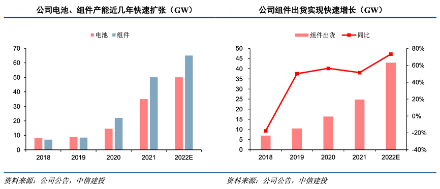 經典案例:根據公司公告、中信建投等綜合資訊表明,天合光能公司是老牌組件企業,2021 年組件出貨24.8GW,且過去 10 年穩居行業第一梯隊。2020 年回 A 以來公司加速擴產,并于當年攜手硅片、電池等環節合作伙伴共同推出了 210 大尺寸硅片、電池、組件,并主導成立了 “600W+產品創新開放生態聯盟”,2021年底公司電池、組件產能分別達到 35、50GW,其中 210 大尺寸產能占比超過70%。