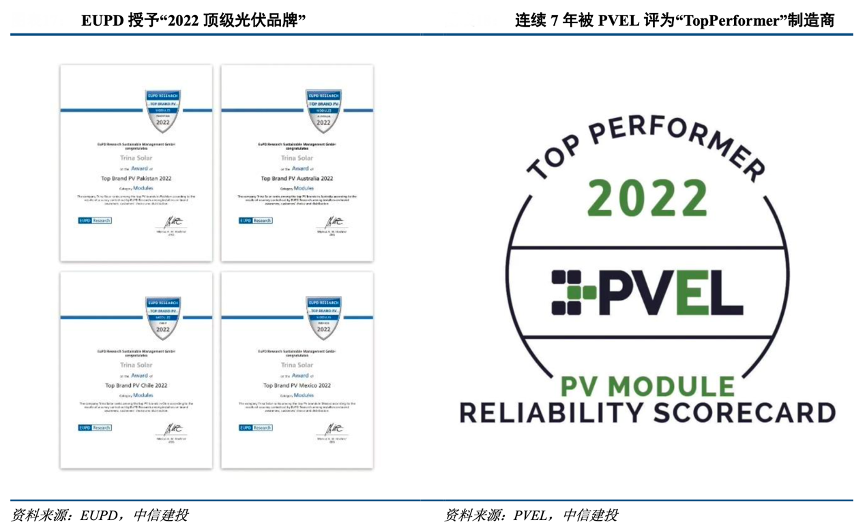 經典案例:根據EUPD、PVEL、中信建投等綜合資訊表明,2022年,天合光能以超高的客戶滿意度得分被全球權威高質量市場研究機 構 EUPD Research 授予“頂級光伏品牌”,在澳大利亞、巴基斯坦、智利、墨西哥等全球重要光伏市場被評為頂級太陽能品牌。同時,被全球權威獨立的光伏組件性能測試實驗室 PVEL 認證為全球“Top Performer”組件制造商,而這也是天合光能連續第八年獲此殊榮,成為光伏行業中獲此頂尖評級次數最多的企業。